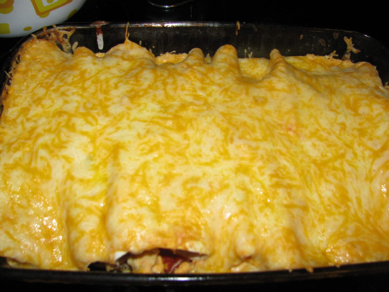 | I sprayed a Pyrex baking dish with non stick spray and added a little salsa on the bottom of the pan, this keeps the tortillas from sticking to the bottom of the baking dish. |