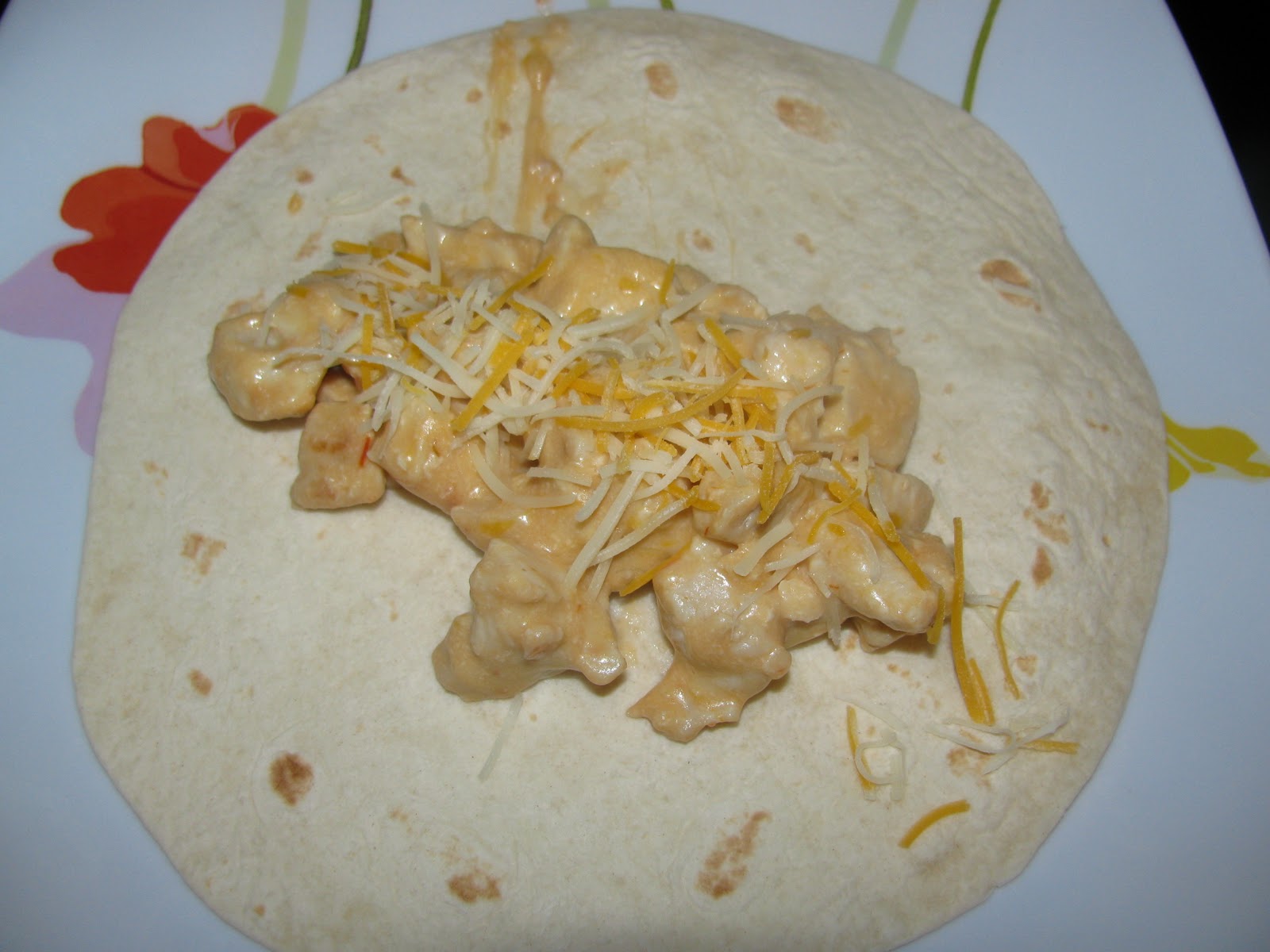 | Spoon chicken mixture onto tortilla and sprinkle with a little more cheese. . |