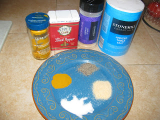 | For spices you are going to need 1 1/2 tsp salt, 1 1/2 tsp garlic powder, 1 tsp of black pepper and 1 tsp turmeric. |