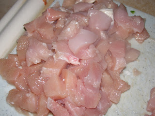 | I have chopped up 3 boneless skinless chicken breasts into bite sized pieces. |