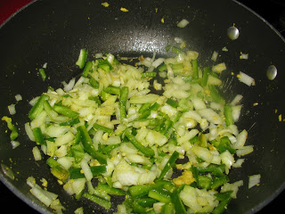 | In the same pan heat another tablespoon of olive and heat over med-high heat. Add the green peppers, and onions. Cook for about 4-5 minutes or until they are starting to get tender. |