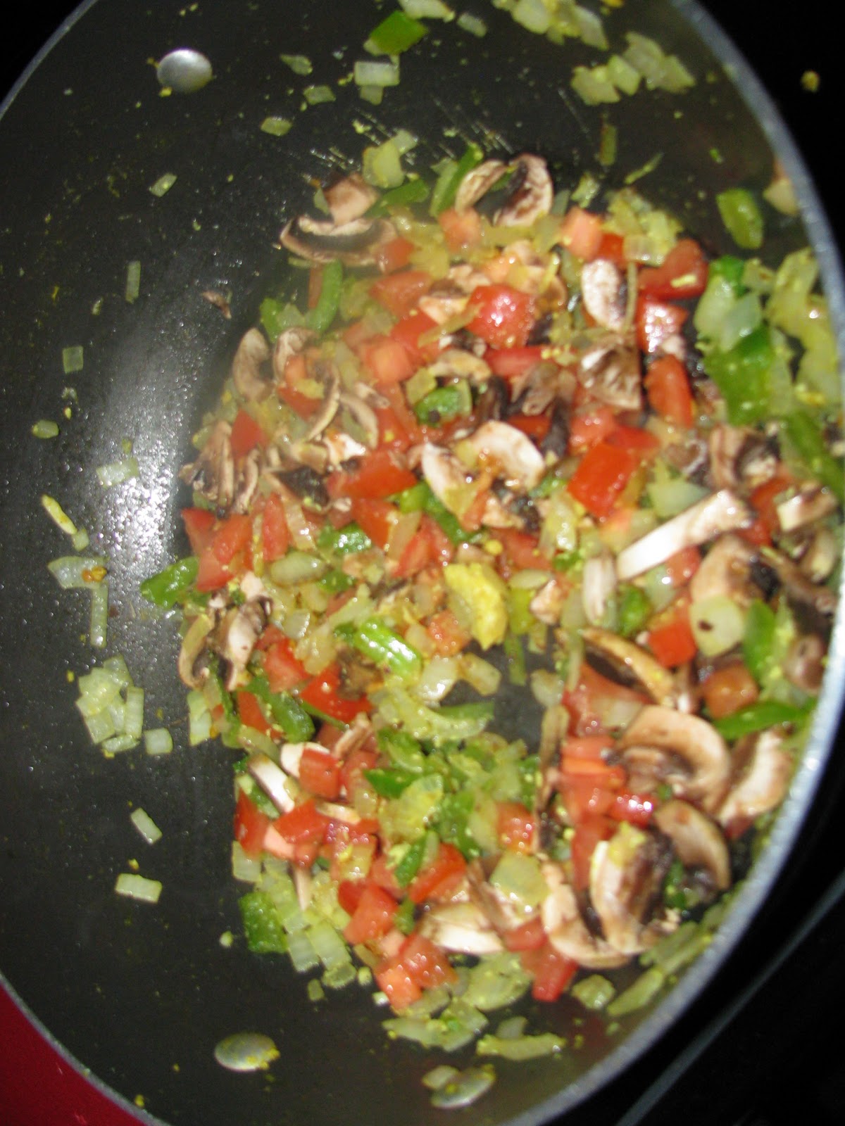- In the same pan add another Tablespoon of olive oil and heat over med-high heat. Add the green pepper and onion. Cook 4-5 minutes or until they are starting to get tender. Add the mushrooms and tomatoes and cook an additional 2-3 minutes or until the veggies are tender. Add garlic and cook a minute longer.