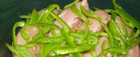 | In a large slowcooker add 4-5 boneless skinless chicken breasts. Add 1 1/2 green bell peppers on top of chicken. |